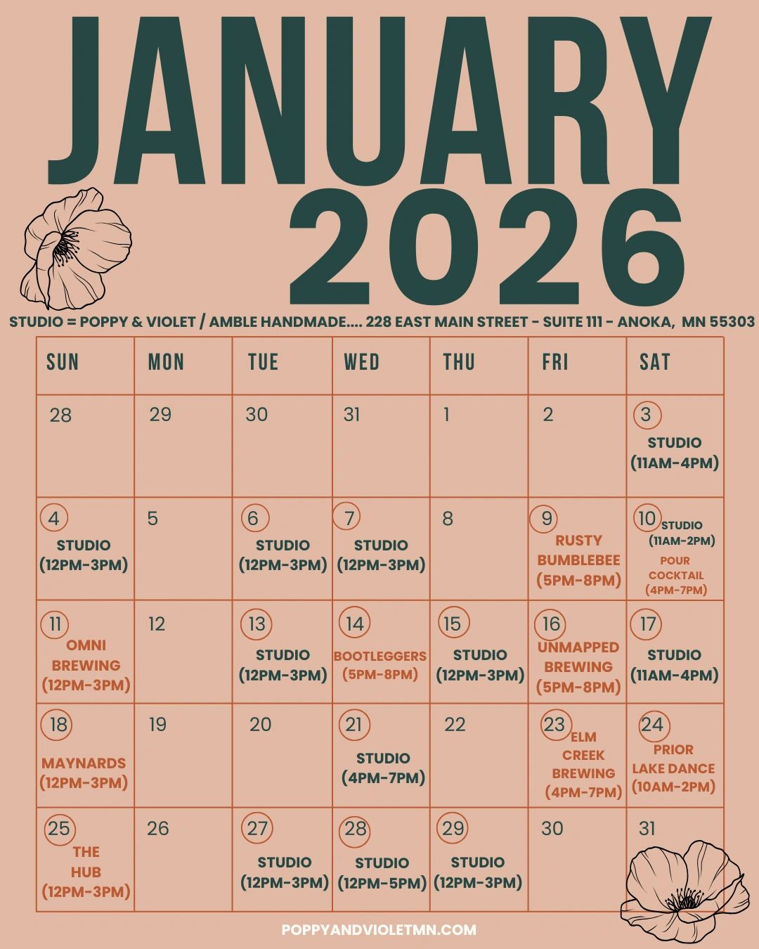 Poppy & Violet is sharing the space with Amble Handmade, she makes the best handmade jewelry and also works for Poppy & Violet! At the moment we are focusing on appointments and walk ins. As for hours we are updating them week to week until we have more set hours for the store. Keep your eye out on our socials - every Sunday we will update the hours for the week.